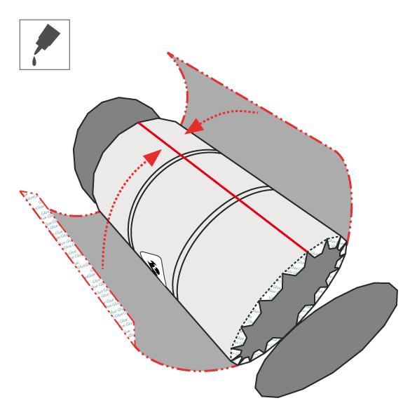 4)折り曲げ:下図を参照して接着箇所のタブを折り、円柱型の物体で面を曲げます。